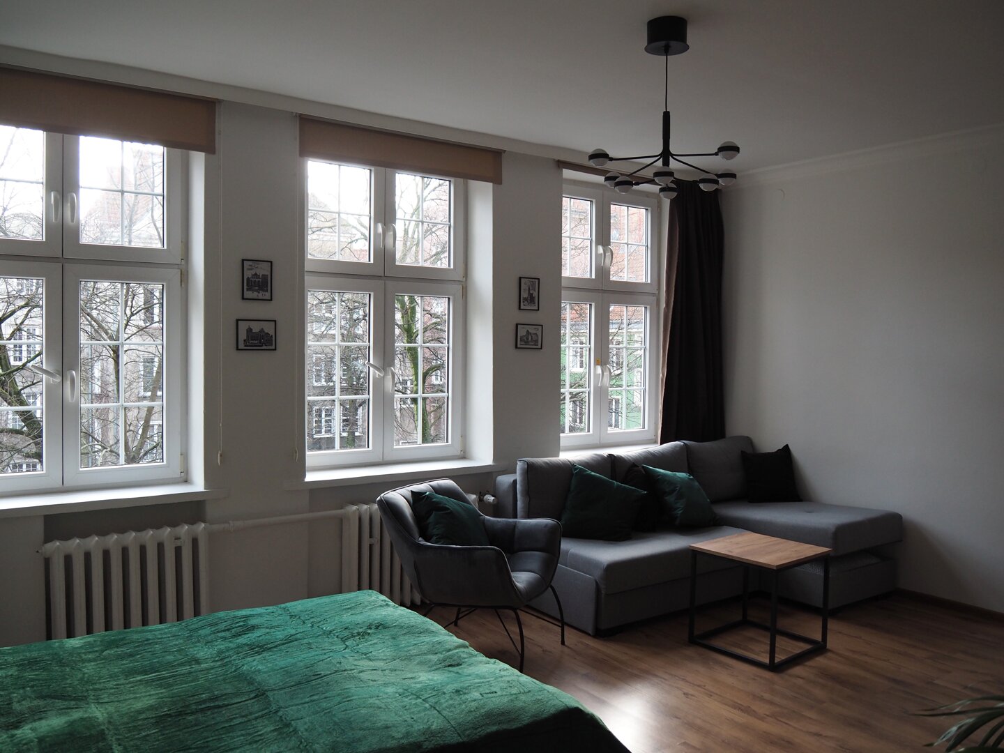 A modern large studio for up to 4 people. The apartment is located on the ground floor of a 3-story building. Great location in the old town, close to the train stationm and Madison shopping center.