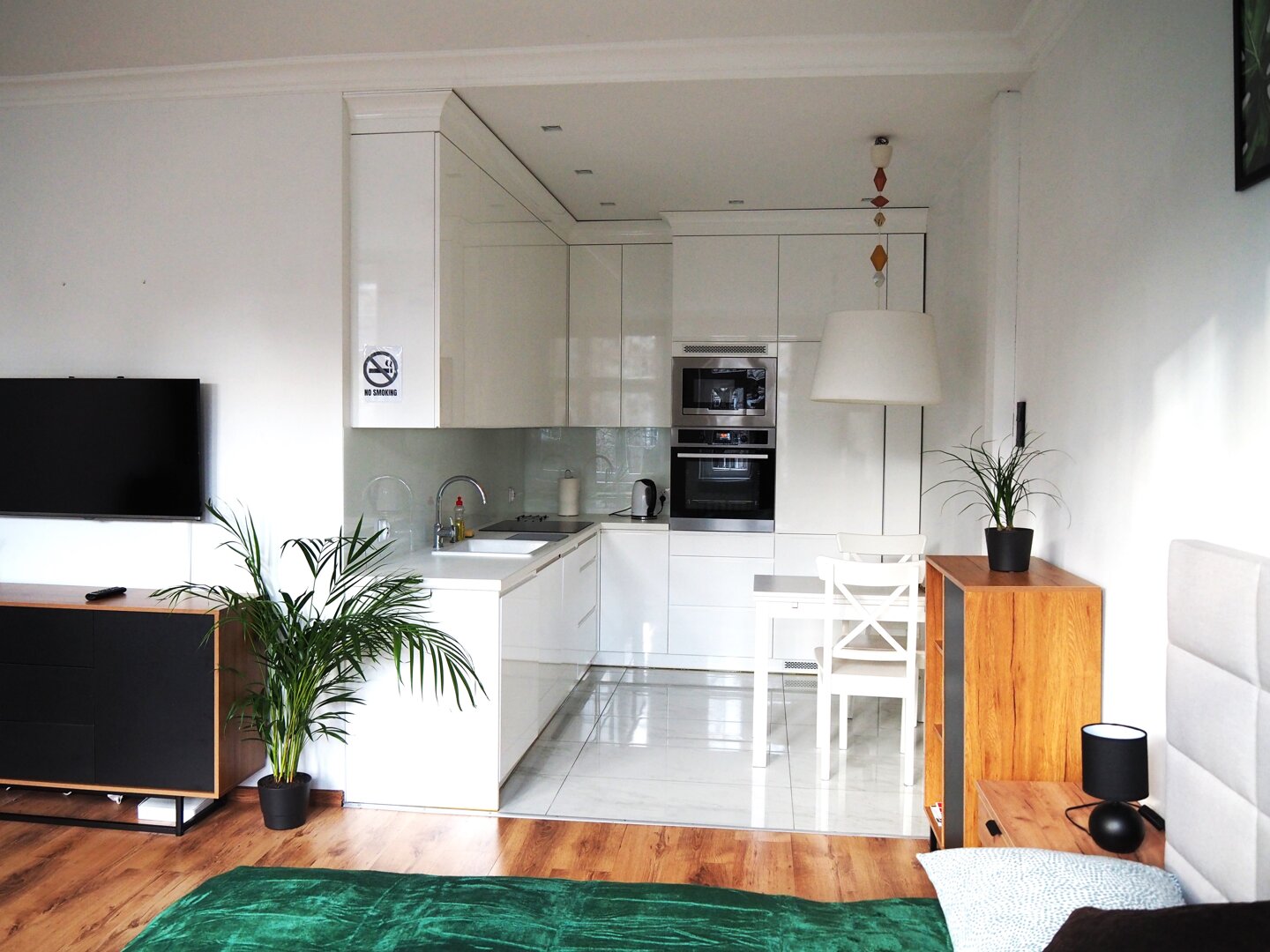 This is studio with double bed and open plan kitchen . Kitchen full fitted Bathroom with shower . Washing machine. A view from the windows to the most beautiful part of Gdańsk